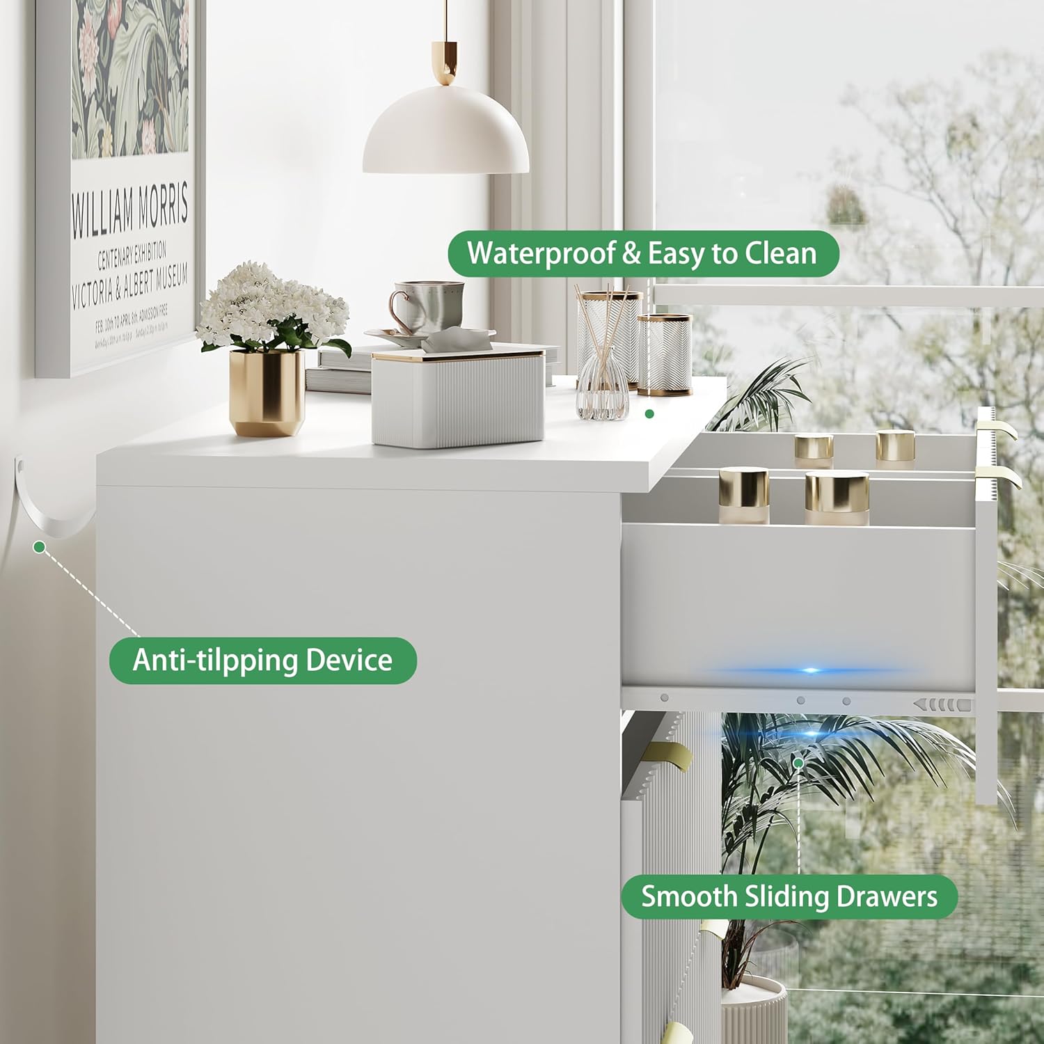 - 【Modern Chic Appearance】The unique wave-like fluted panel enhances the texture and elegance of this bedroom dresser. The thick table top features natural wood grain that complements the white finish. The wide metal handle and splayed base legs add a modern touch, creating a personalized and distinctive appearance