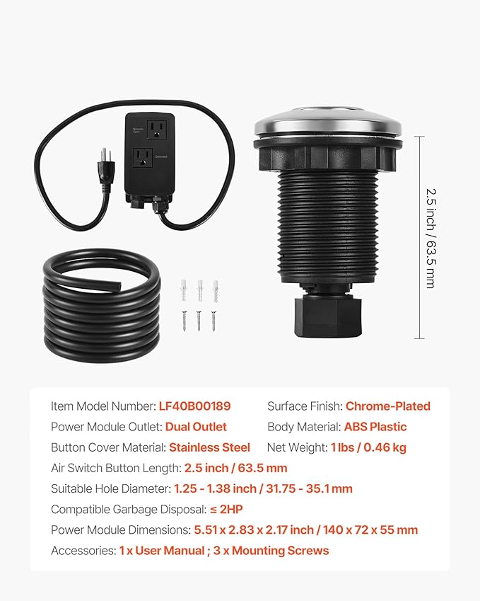 - Wide Compatibility: This VEVOR garbage disposal air switch kit fits standard sink hole diameters of 1.25–1.38 inch / 31.75–35.1 mm. The air switch button is 2.5 inch / 63.5 mm long, suitable for stainless steel sink countertops and compatible with most garbage disposal brands (≤2HP)