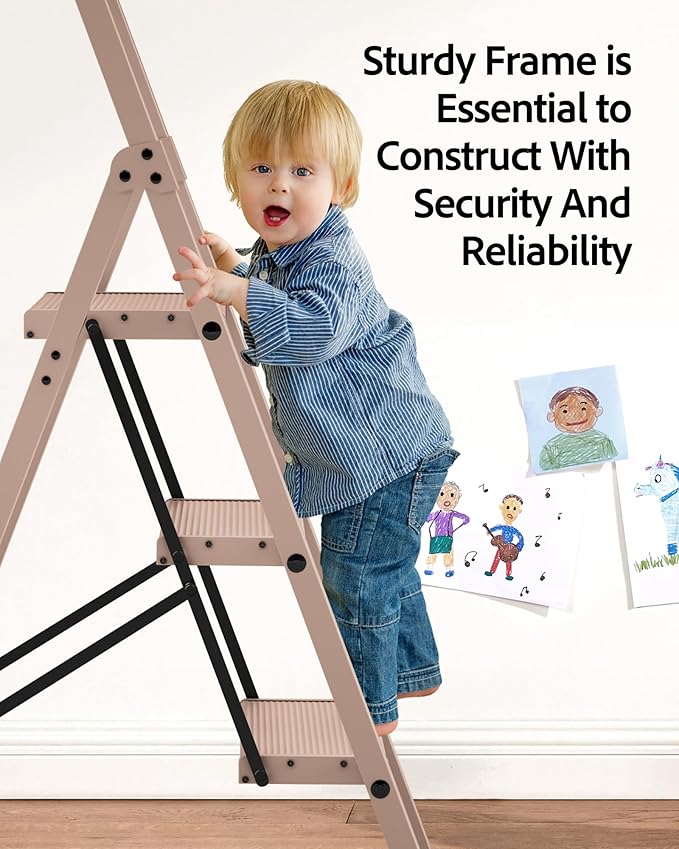 Taranta 3 Step Ladder, Lightweight Aluminum Step Stool with Convenient Handgrip, Folding Ladder with Anti-Slip Pedals, 330lbs Capacity Stepladder for Home, Office, Kitchen - Peach Pink