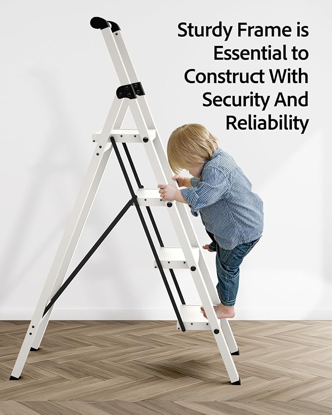 Taranta 4 Step Ladder, Lightweight Aluminum Step Stool with Convenient Handgrip, Folding Ladder with Anti-Slip Pedals, 330lbs Capacity Stepladder for Home, Office, Kitchen - White
