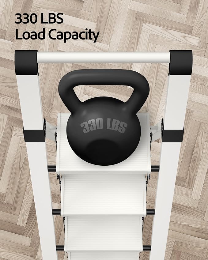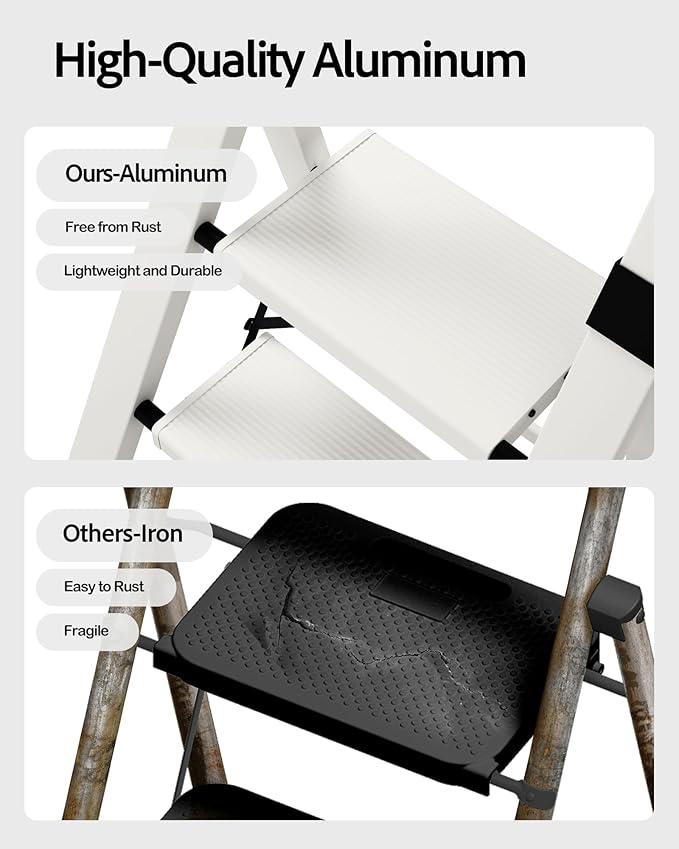 - Non-slip Design - Top step width 7.1 inches,offer ample space to stand security during use and make more comfortable for users.Prominent parallel lines on each step surface prevent slipping .Thick rubber foot pads contact fully with the ground,keeping the ladder stability and safety.