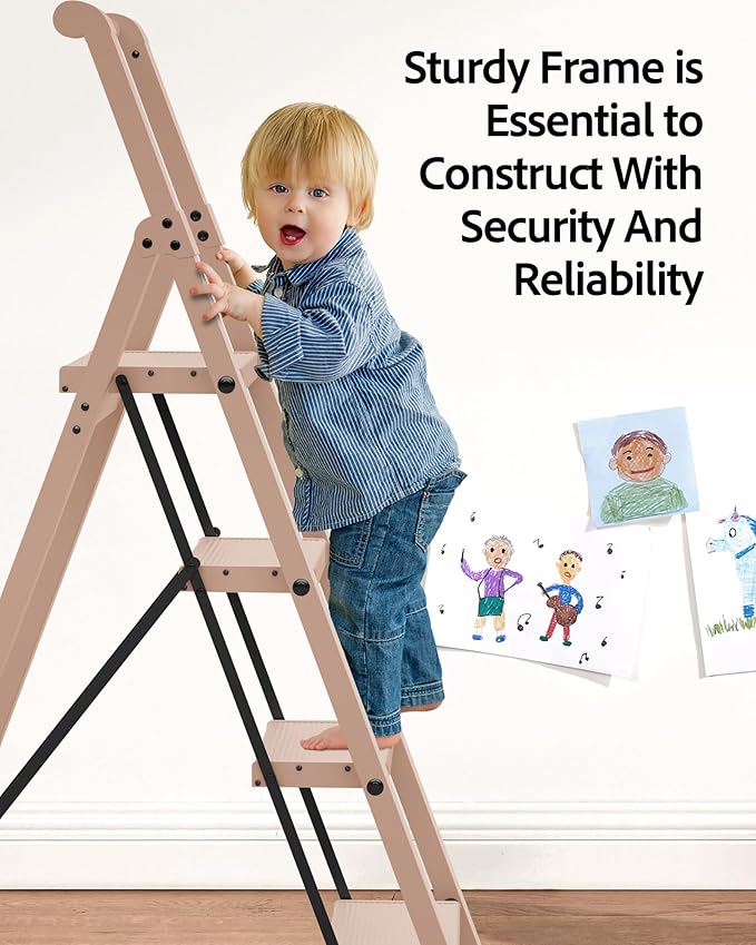 Taranta 4 Step Ladder, Lightweight Aluminum Step Stool with Convenient Handgrip, Folding Ladder with Anti-Slip Pedals, 330lbs Capacity Stepladder for Home, Office, Kitchen - Peach Pink
