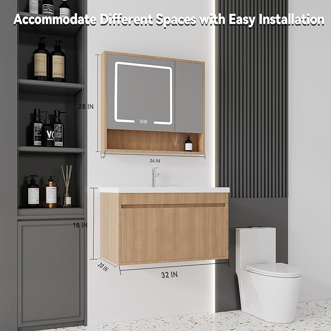 - 【Includes Matching LED Medicine Cabinets】- Our 32"W x 28"H lighted medicine cabinet features innovative low-voltage anti-fog technology,Adjustable LED Lighting with Three Color Temperatures and Dimming Function.enhanced hinges facilitate a quiet and smooth door closure, eliminating loud slamming and enhancing the longevity of the LED medicine cabinet.