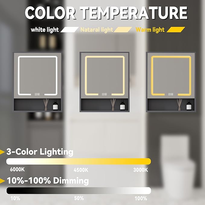 - 【Includes Matching LED Medicine Cabinets】- Our 24"W x 28"H lighted medicine cabinet features innovative low-voltage anti-fog technology,Adjustable LED Lighting with Three Color Temperatures and Dimming Function.enhanced hinges facilitate a quiet and smooth door closure, eliminating loud slamming and enhancing the longevity of the LED medicine cabinet.