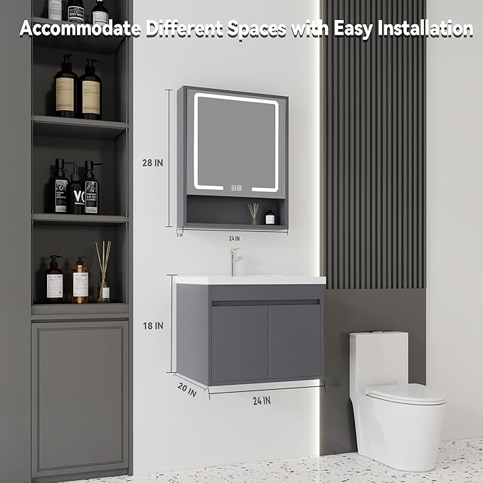 - 【Includes Matching LED Medicine Cabinets】- Our 24"W x 28"H lighted medicine cabinet features innovative low-voltage anti-fog technology,Adjustable LED Lighting with Three Color Temperatures and Dimming Function.enhanced hinges facilitate a quiet and smooth door closure, eliminating loud slamming and enhancing the longevity of the LED medicine cabinet.