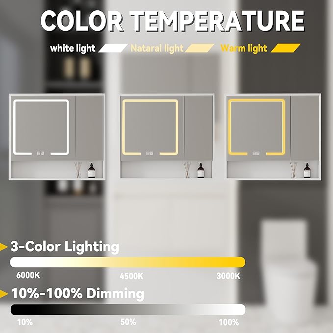 - 【Includes Matching LED Medicine Cabinets】- Our 32"W x 28"H lighted medicine cabinet features innovative low-voltage anti-fog technology,Adjustable LED Lighting with Three Color Temperatures and Dimming Function.enhanced hinges facilitate a quiet and smooth door closure, eliminating loud slamming and enhancing the longevity of the LED medicine cabinet.