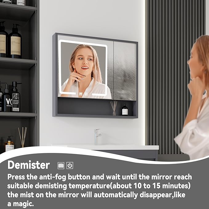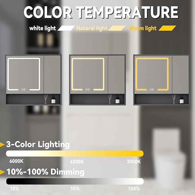 - 【Includes Matching LED Medicine Cabinets】- Our 32"W x 28"H lighted medicine cabinet features innovative low-voltage anti-fog technology,Adjustable LED Lighting with Three Color Temperatures and Dimming Function.enhanced hinges facilitate a quiet and smooth door closure, eliminating loud slamming and enhancing the longevity of the LED medicine cabinet.