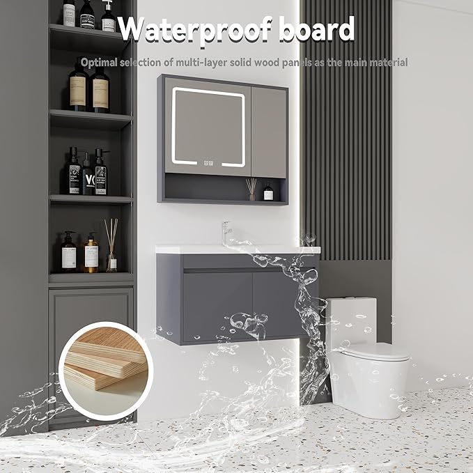 - 【Soft Close Doors】- The grey bathroom vanity is equipped with soft-close doors that provide ample storage space for all your bathroom essentials. These drawers close smoothly and silently, thanks to the soft-close door hinges. They also seal tightly to prevent humidity from entering and damaging the objects inside, keeping your belongings safe and dry.