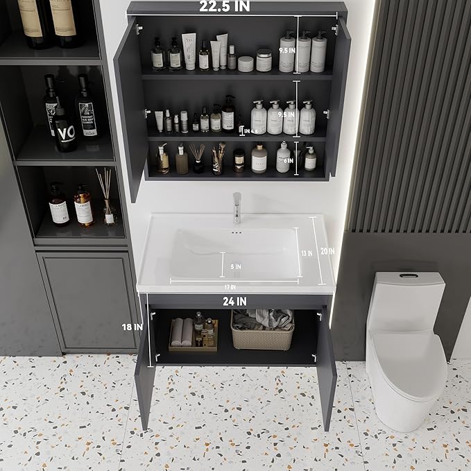 - 【Simple Installation】- The grey vanity comes pre-assembled out of the box, making the installation process quick and easy. Only minor finishing up assembly is required, which can be done in approximately 20 minutes. The package includes a step-by-step, easy-to-follow clear instruction guide, along with all the necessary hardware. The spacious under-sink cabinet provides easy access for plumbing installation.