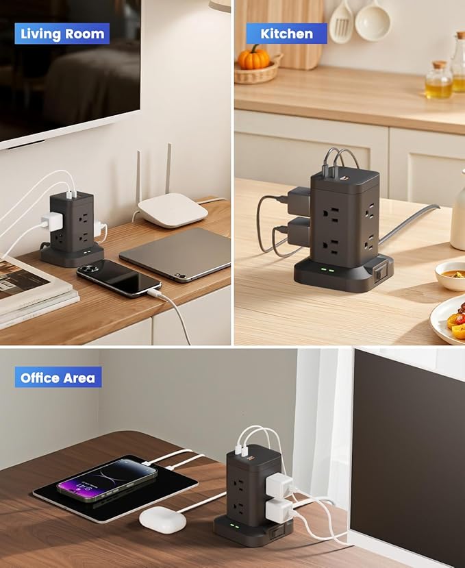 - 11-IN-1 Power Strip Tower: This power strip tower surge protector features 8 AC outlets and 3 smart USB ports (2 USB-C) (Max 5V/3.4A) for up to 11 devices,It serves as a surge protector charging station for office, school, and dorm room essentials.