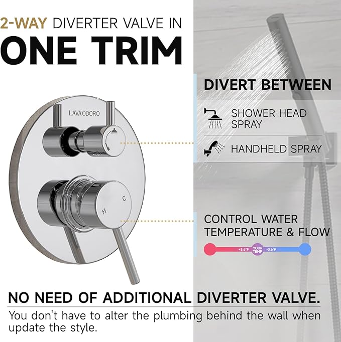 - Functional Trim - The controls of the rain shower head and the handheld shower are integrated in one shower diverter. The single shower handle enable 100 arc degrees to control water temperature and flow. Conceal Screws Design - The trim mounting screws are not visible offering a clean look for the shower trim