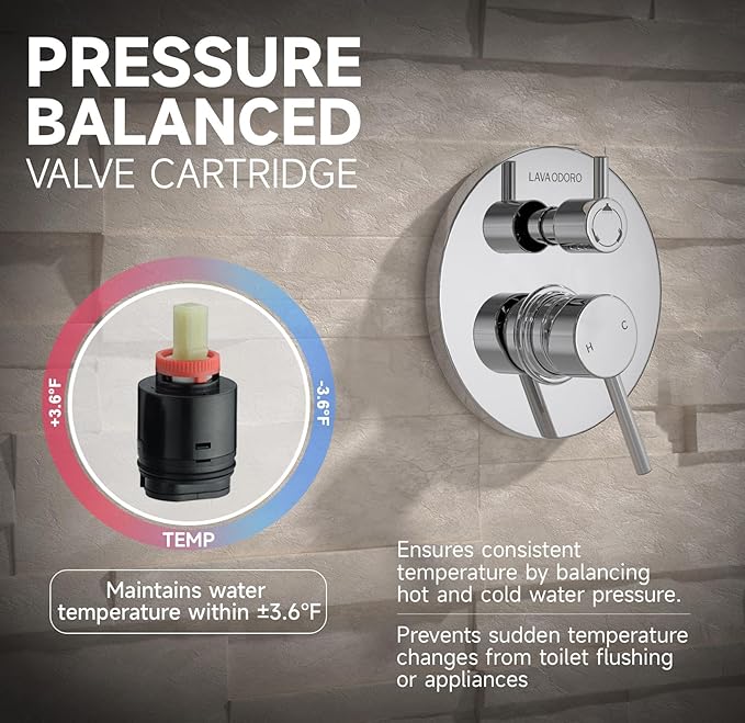- Consistent Shower Temperature - With brass Pressure-Balanced Valve and included ceramic catridge to monitor the water pressure balance, it can shield against sudden temperature fluctuations. The exclusive integral stop of the valve can be adjusted to control the water flow and can be closed while replacing the cartridge instead of turning off the main switch in the house