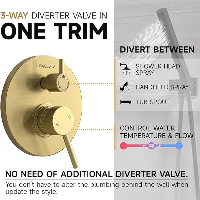 Lava Odoro Modern 3-Setting Round Rain Bathtub and Shower Faucet Set, Gold Rainfall Shower Head and Handle Set, Rain Shower System with Tub Spout, Shower Valve Trim Kit, Brushed Gold, SF104-SG-T
