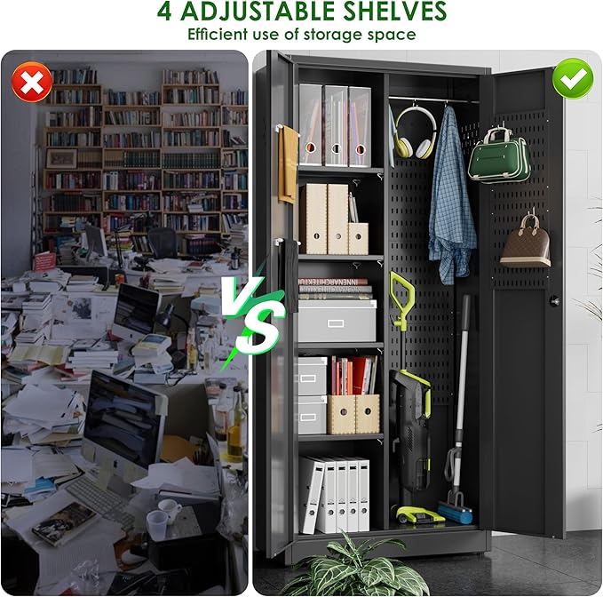 - 【SECURITY & PRIVACY】The metal Utility Closet Storage Cabinet features a locking system and pegboards, which can cleverly and efficiently protect important items and documents. Additionally, the metal cabinet door is equipped with a key, ensuring you do not need to worry about the privacy and security of the cabinet.