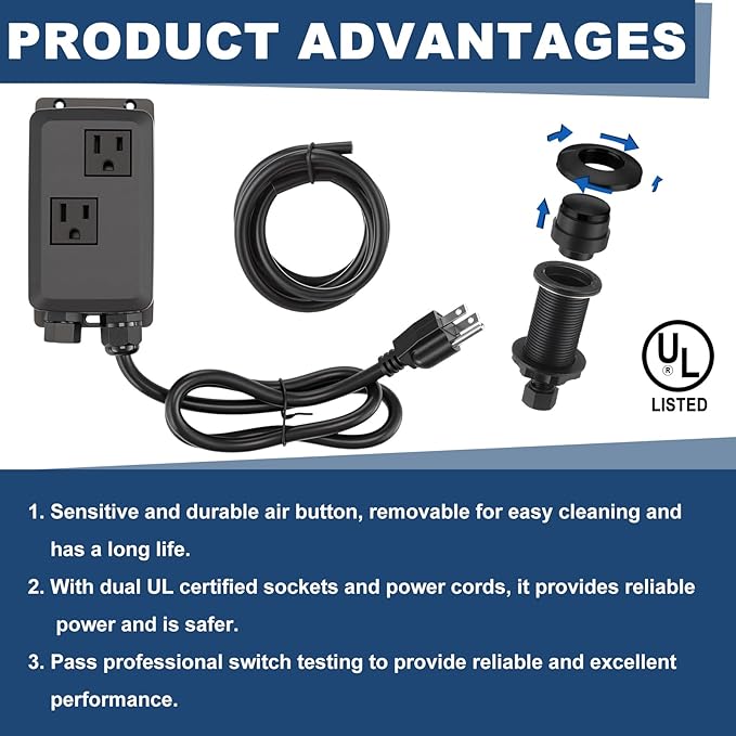 - Safe and reliable: This air switch kit has been fully certified by UL (covering power cords and overall safety), is made of strength corrosion resistant materials, and has a waterproof and moisture-proof design, effectively eliminating the risk of electric shock in the kitchen environment and ensuring worry free use