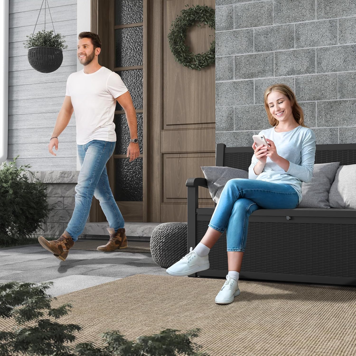 - Comfortable Seating: Beyond being a storage bench outside, it functions as a cozy seating option, the bench seat is spacious enough to seat 2–3 people, with a weight capacity of 500 lbs. Designed as a practical patio bench with storage, it includes a backrest and armrests to enhance comfort, making it perfect for relaxing after outdoor activities.