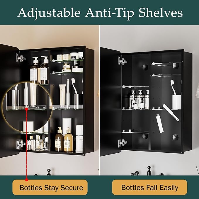 - Adjustable Shelves – Customize the internal space with adjustable glass shelves, offering ample storage for toiletries, medications, and other bathroom essentials.