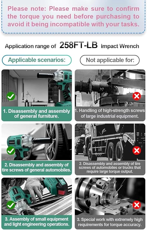 - 【Cordless Impact Wrench with Variable Speed & Reversible Function】The Cordless Impact Wrench delivers 258ft-lb (350N.m) torque and up to 2800rpm speed, perfect for furniture assembly, car tire bolts, and light engineering tasks. Its reversible function changes rotation direction, featuring an auto-stop mode for reverse. The Cordless Impact Wrench is not suitable for high-strength bolts in heavy industrial equipment requiring precision torque. For such uses, consider other tools.