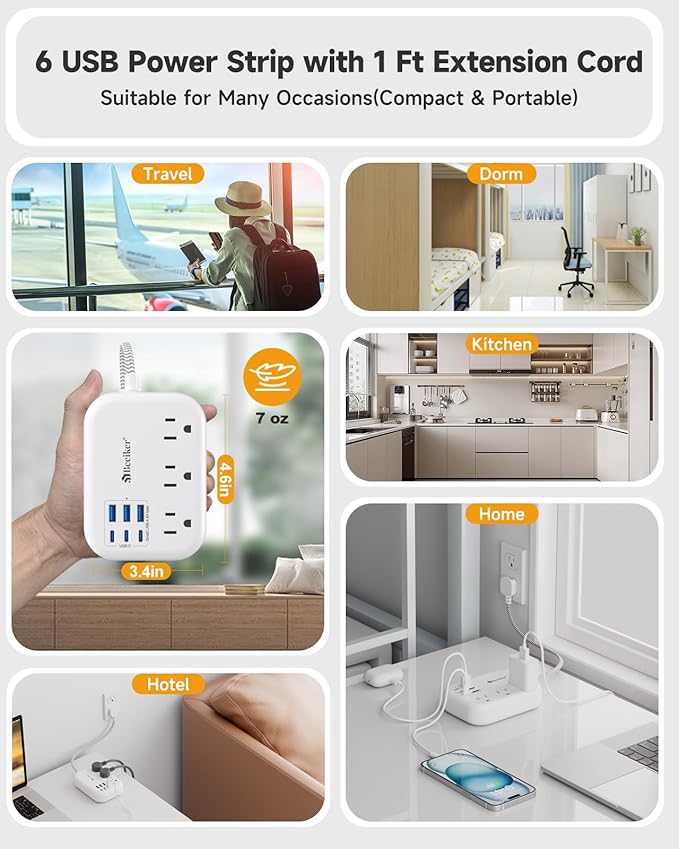 - 【Compact for Travel】-Compact Size and lightweight(7 oz) design to fit into luggage and bag while traveling. The small extension cord 1ft also can be used in any indoor place with socket, Perfect solution for travel and dorm room,behind the sofa,kitchen,office etc