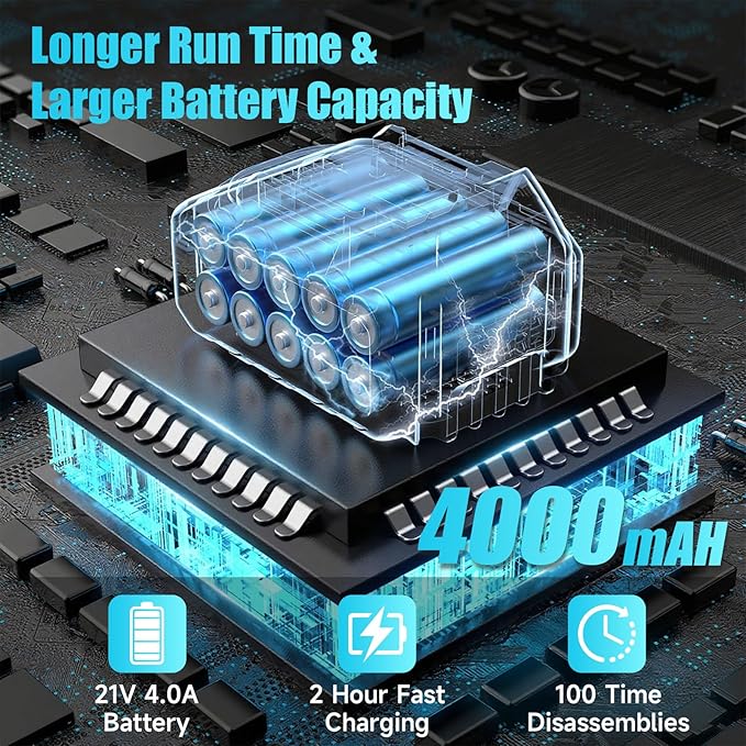 - 【2 × 4.0Ah Batteries & Fast Charger】:With a 4.0 Ah battery as well as a fast charger, you are allowed to face continuous work with ease. Cordless impact wrench 1/2 inch only takes 1-2 hours to fully charge, so you don't need to worry about running out of power at all. 15 minutes of charging is enough for emergency use for half an hour. It can be disassembled 100 times when fully charged!