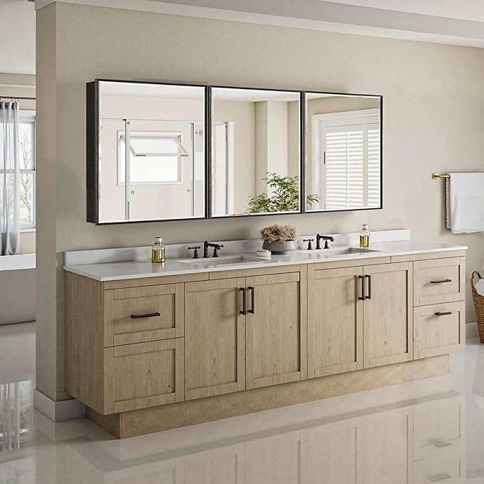 - HD Eco-Friendly Mirror & Adjustable Glass Shelves - The mirror is a 3RD eco-friendly mirror known for its excellent oxidation resistance and low heavy metal content, preventing darken, black spots, or edges. The mirror surface is ultra-flat with no distortion, providing 100% HD reflection. Inside, it features height-adjustable tempered glass shelves, which are stain-resistant, and easy to clean.