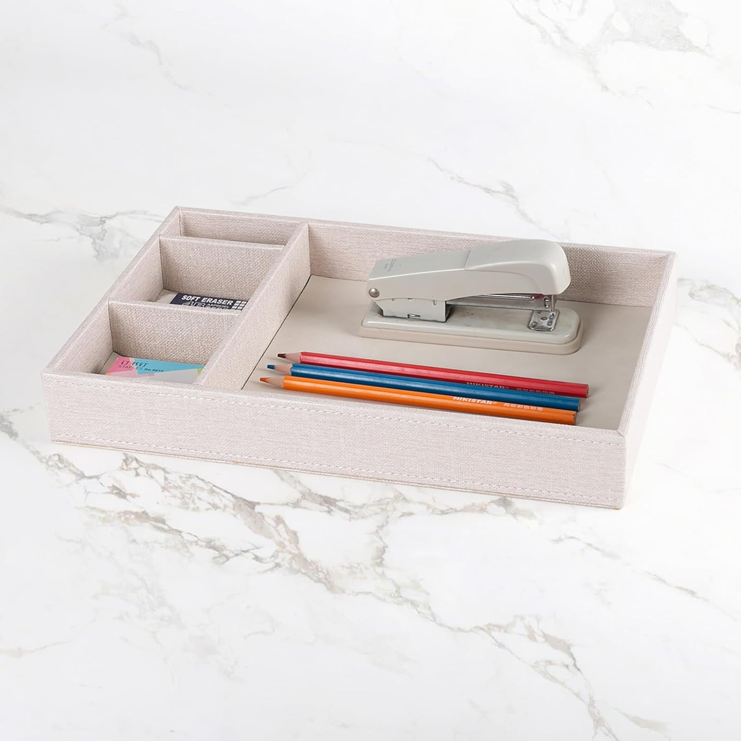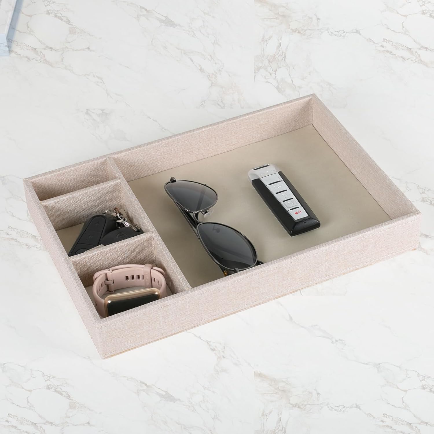 Desktop Storage Organizer, Nightstand or Dresser Organizer, Valet Tray, Entry Table Organizer, 4 Compartments,PU Leather Drawer Storage Organizer Decorative Trays. (Pearl White—2)