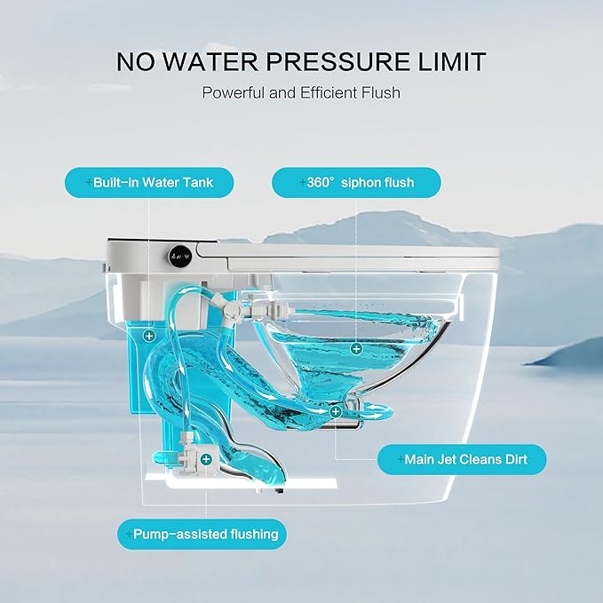 - Powerful & Efficient Flush – Advanced 360° siphon vortex jet technology with built-in large-capacity tank and pump delivers a strong, thorough flush without requiring water pressure. Suitable for all households.