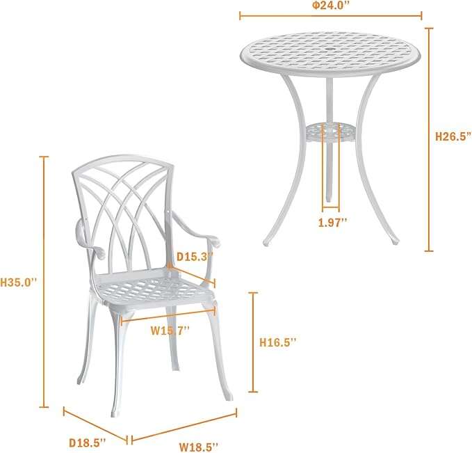 - 【Patio Bistro Set】Contains 1 round cafe table and 2 chairs. Table dimensions: Dia 24" x H 26.5". Chair dimensions: 18.5"D x 18.5"W x 35"H with a maximum weight capacity of 200 lbs