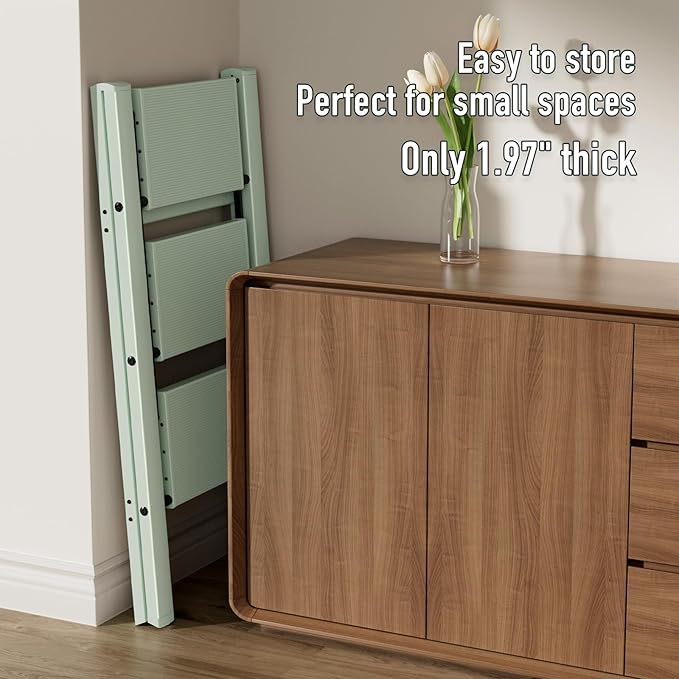 - 【Lightweight & No Assembly Required】 Net Weight: 7.9 lbs.Folded Thickness: Only 1.9 inches.This compact design makes it easy to carry and store, fitting into any corner of your home. Fully assembled and can be quickly opened and folded in seconds. The distance between each step is 9.4 inches.
