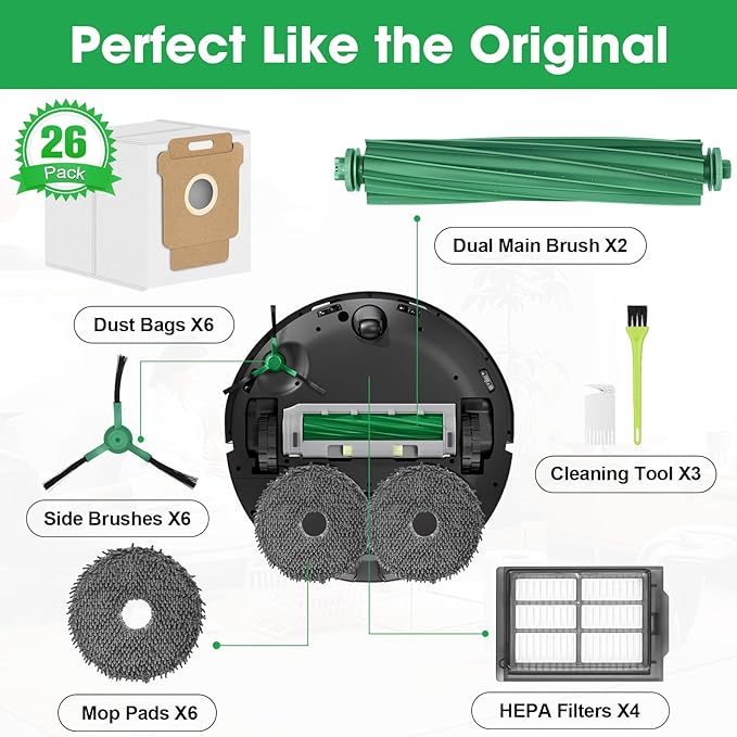 26 PCS 405 Combo Accessories Replacement Parts for iRobot Roomba Plus 405/505 Combo Kit Accessory Set, 2 Roller Main Brushes, 6 vacuum Dust Bags 6 Mop Pads 4 Hepa Filters 6 Side Brushes