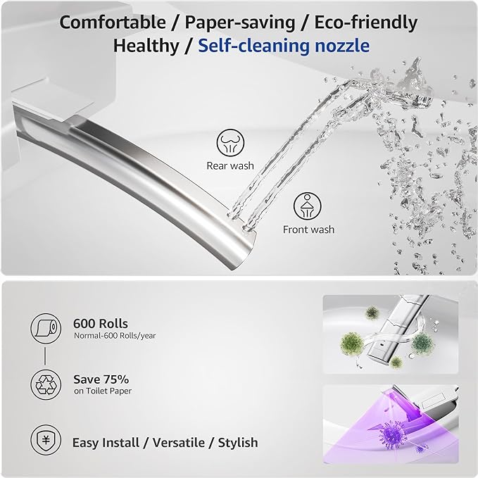 - 🚿 【Multiple Cleaning Modes & Foam Shield】 Offers posterior, feminine, and massage cleaning with filtered water, plus warm air drying. Foam Shield reduces splashes, odors, and keeps the bowl cleaner