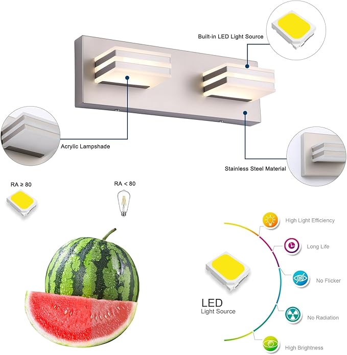 - 3-color adjustable: Our brushed nickel bathroom lighting fixtures can provide 3 color temperatures according to your actual needs. You can change the light color once by pressing the wall switch, and freely choose soft white light/neutral light/warm light to meet your mood.