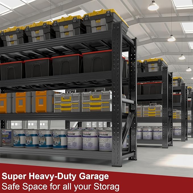 - 【3000LBS Capacity Heavy Duty Garage Shelving】This shelving unit features 4 tiers, each capable of supporting 3000 lbs, for a total weight capacity of 12000 lbs. It effortlessly addresses your storage needs for heavy items, making it ideal for organizing tools, kitchen supplies, and outdoor patio essentials.