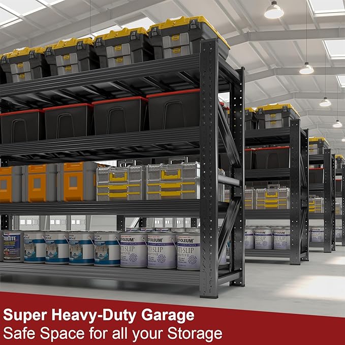 - 【3000LBS Capacity Heavy Duty Garage Shelving】This shelving unit features 4 tiers, each capable of supporting 3000 lbs, for a total weight capacity of 12000 lbs. It effortlessly addresses your storage needs for heavy items, making it ideal for organizing tools, kitchen supplies, and outdoor patio essentials.