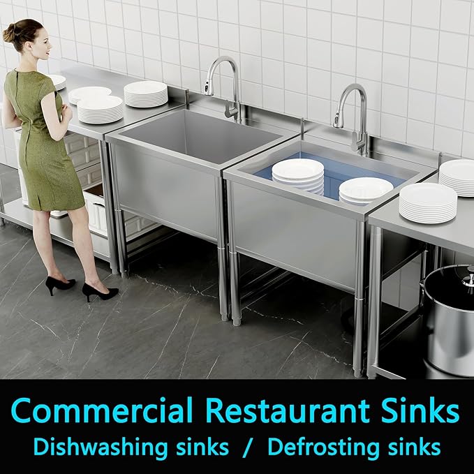 - Large and Deep Basin: Features a spacious 15.7" deep basin, perfect for dishwashing, vegetable cleaning, or thawing meats in commercial restaurant kitchens. It excels at handling large items, soaking clothes and bedding, or cleaning and bathing pets - free from spills or space constraints.
