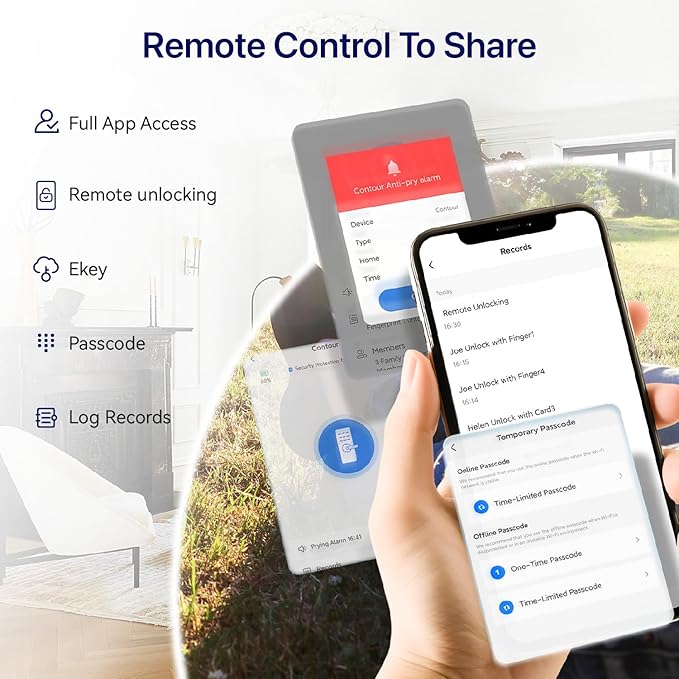 - [REMOTE CONTROL WITH DOORBELL CAMERA] When someone presses the doorbell, the smart door lock takes a picture and sends a notification to your phone immediately. You can send a one-time code or slide to unlock the door in the app. Note 1> Remote unlock function is triggered passively by pressing the doorbell on the smart lock, 2> The camera does not have a video call or recording function, 3> Not compatible with smart homes such as Alexa and Google Assistant