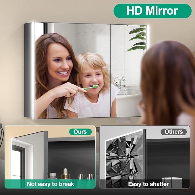 - 【Stepless Adjustable Lighting Medicine Cabinet】The medicine cabinet lighting features ultra-bright, high-density LED strips, you can long press the mirror button to adjust the lights from 10% to 100%, it can provides more even and enhanced light, which can bring out the truest colors and details of your image.