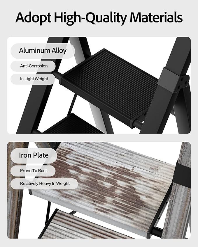 - [Anti-Slip Pedal] Aluminum frame of the folding step stool is constructed with durability and the side cross bracestructure strengthens the basic support. The surface of the pedal is designed with prominent lines to prevent slipping