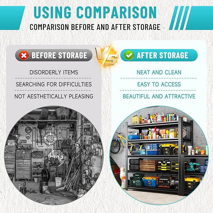 - 【Flexible Height Adjustment, Greatly Improve Space Utilization】This garage shelf can freely raise and lower the height of the five tiers of boards through the design of micro-adjustable slots, which can accurately match the different sizes of items from toolboxes and paint buckets to engines, containers and other items, and improves the utilization rate of each tier! The garage shelves are designed with tool-less adjustments, locking with the push of a finger, no need to remove bolts, and switching can be done in less than 30 seconds.