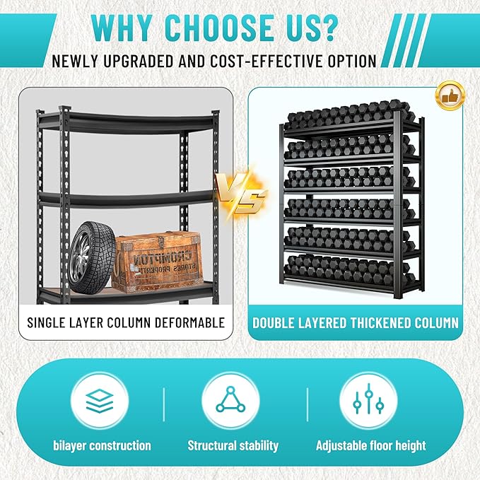 - 【The double-layer column is more stable and reliable】Our garage shelves adopt double-layer columns, which are more stable and reliable than single-layer columns on the market. In the process of long-term use, there will be no bending and warping. The double-layer column greatly improves the weighing capacity of the partition, and even if a heavy object like an engine is placed on it, it will not shake.