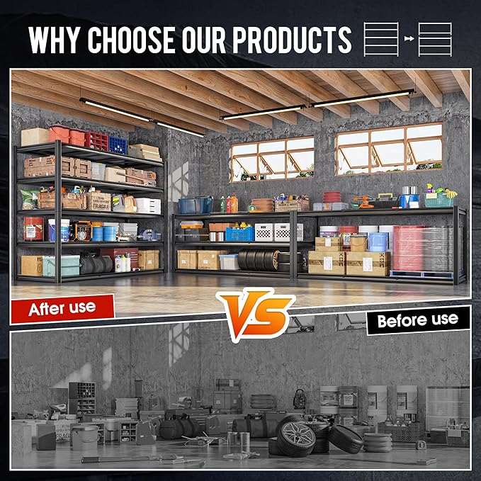 - 【Ultra-Safe Industrial-grade Load-bearing System】 Made of commercial-grade cold-rolled steel and reinforced structure, The garage shelving is specially designed for heavy-duty warehouses. The specially designed powder coating on the surface not only prevents rust and scratches but also makes it easy to clean. It is equipped with a professional anti-tipping kit as standard, ensuring absolute stability. This is not merely a tool, but a lifelong investment you plan for your garage