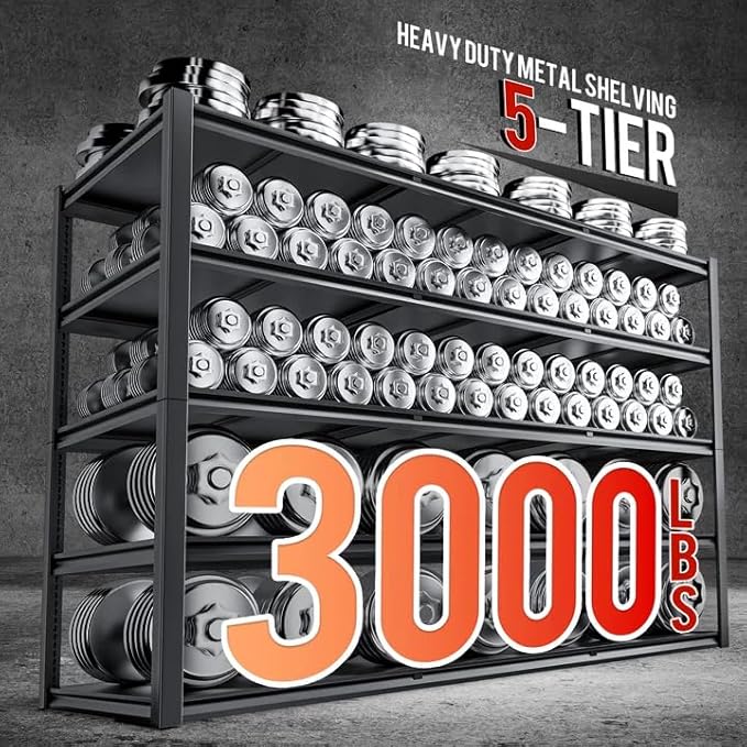 - 【Heavy Duty Shelving 3000 LBS Capacity】 Supported by a reinforced frame with 5 sturdy support ribs, this unit has a huge total weight capacity of 3000 pounds (600 pounds per rack). Store heavy vehicle parts, aquaculture fish tanks, toolboxes, camping equipment, sports goods, paint cans, potted plants and books with confidence without worrying about bending or toppling over