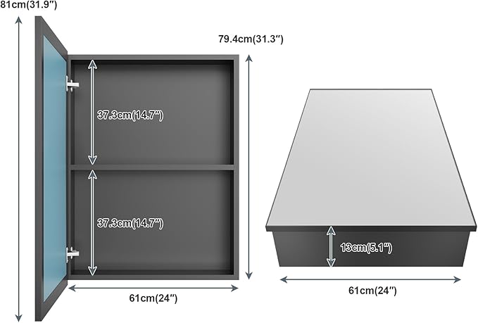 - Bathroom Cabinet Dimensions: 32’’H x 24’’W x 5”D bathroom medicine cabinet with 2 storage shelves, The size of each shelves is 14.7x24 inches. Our mirror cabinet can provide sufficient storage space for your use. With our mirror cabinet, you can keep your bathroom looking tidy and organized, making it a perfect addition to your home!