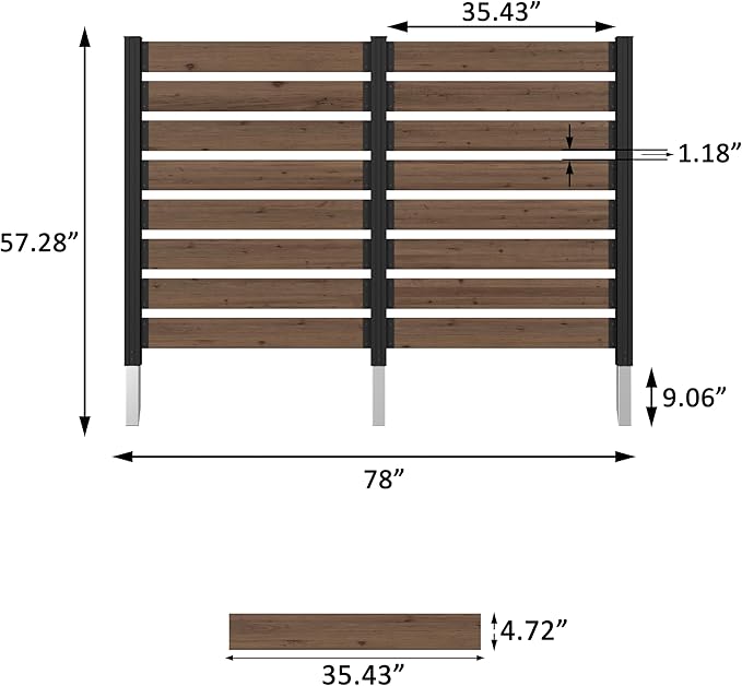 - DIMENSIONS - Once assembled, your wood fence panels will measure 48.74''H x 78''W(on ground). The dimensions of boards are: 4.72"W×35.43"L, and the gap between boards is 1.18 ". In addition, this privacy wooden screen is equipped with 9.06 "upgraded metal stakes, which are suitable for hard ground and soil for extra privacy around your patio, deck, garden, or backyard.